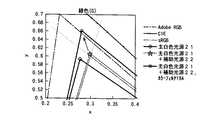 図10b、10c、10dは、図10aに示したxy色度図における緑色(G)、青色(B)、赤色(R)の各領域を拡大した図である。なお、図10a、10b、10c、10dのxy色度図中には、Adobe  RGB規格の色再現範囲、国際照明委員会(CIE)が定めたXYZ表色系、sRGB規格の色再現範囲、主白色光源21のみを光源として使用した場合の色再現範囲も同時に示してある。  10b, 10c, and 10d are enlarged views of green (G), blue (B), and red (R) regions in the xy chromaticity diagram shown in FIG. 10a. In the xy chromaticity diagrams of FIGS. 10a, 10b, 10c, and 10d, the color reproduction range of the Adobe RGB standard, the XYZ color system defined by the International Lighting Commission (CIE), the color reproduction range of the sRGB standard, The color reproduction range when only the