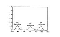 これに対し、カラー液晶表示装置のバックライト装置の光源として用いられる3波長域型のCCFLが発光する白色光は、図11に示すようなスペクトル特性を示し、さまざまな波長帯域で異なる強度の光を含んでいることになる。 On the other hand, white light emitted from a three-wavelength type CCFL used as a light source of a backlight device of a color liquid crystal display device exhibits spectral characteristics as shown in FIG. 11 and has different intensities in various wavelength bands. Will be included.