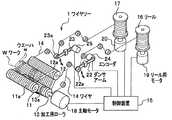 また、前記一対のリール16,17と加工用ローラ11,12,13との間のワイヤ14の走行経路中にはダンサアーム22,23が設けられ、それらの先端に配置されたダンサローラ22a,23aにはワイヤ14が掛けられている。そして、ワイヤ14の走行中に張力変動が発生したとき、ダンサアーム22,23が回動され、その回動量に基づいてエンコーダ24,25からワイヤ張力変動の検出信号が出力される。
