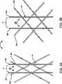 一実施形態では、枠44は多種類の構造的形状を呈して織られており、ステント40の配備中に容易に形の変更を行うことができる。図3Aおよび図3Bに例示されているように、枠44は3方向織りパターン(すなわち、対になって相互に絡み合わされた繊維を3組使う)。このような織りはステント40に与える放射方向強度を比較的大きくすることができる。ステント40の配備中は、バルーンが拡張した結果として枠44が拡張する。より詳細に述べると、拡張は、枠44が拡張するにつれて互いに相関的に増大する、繊維46aと繊維46bの間の角度θ含んでいてもよい。拡張は、繊維46cと繊維46dの間で互いに相関的に増大する間隔Aと両繊維の間で互いに相関的に増大する滑り量のうちいずれか一方、または、その両方を更に含んでいてもよい。また別な実施形態では、枠は構造的な編組、編み物、メッシュなどと、これらとはまた別な織物(例えば、2方向織物)のうちいずれか一方、または、その両方から形成されている。本件発明者らは、本発明による無数の枠形状と枠構成を思量している。  In one embodiment, the