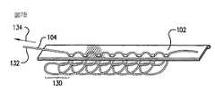 図7A〜Cを参照すると、糸状結合部材(104) と共に用いることのできる1つのスリップノット(slip knot) 構造が記載されている。簡略化のためその中に位置するインプラントを示さず、拘束部材(102) を示す。図7Aは解放が行われる前の状態、あるいは、展開(配置)される前の状態のスリップノットを示している。一連のノットは、拘束部材(102) の表面とほぼ同一高さにあり、また、好ましくは、インプラントの搬送中にインプラントの輪郭からほとんど出っ張らない外形を有する。図7Bは、チェーンノット(130) がどのように形成され得るかを示すため、糸状結合部材(104) を緩めた状態にした図7Aのアセンブリを示している。図7Cは図7A又は7Bのアセンブリの解放工程を略図的に示している。図示のステッチ(編目)は糸の一端を引くことにより解放され、その結果、円筒状又は管状の拘束部材が解放されて、装置が展開される(使用状態にされる)。この特殊な編み方はチェーンステッチと称され、単一の針と単一の糸によりつくり出すことができる。チェーンステッチは一連のループかスリップノットであって、相互に輪にされ1つのスリップノットが次のスリップノットが解放するのを阻止している。糸が引かれてスリップノットを解放すると、続くスリップノットが解放されて、それが次のスリップノットを解放する。この作用は全部の糸が拘束部材から引出されるまで糸の引出しの間続けられる。 Referring to FIGS. 7A-C, one slip knot structure that can be used with the thread-like coupling member (104) is described. For simplicity, the restraining member (102) is shown without showing the implant located therein. FIG. 7A shows a slip knot in a state before release or before deployment (arrangement). The series of knots is approximately flush with the surface of the restraining member (102) and preferably has a profile that hardly protrudes from the contour of the implant during delivery of the implant. FIG. 7B shows the assembly of FIG. 7A with the threaded coupling member (104) loosened to show how the chain knot (130) can be formed. FIG. 7C schematically illustrates the release process of the assembly of FIG. 7A or 7B. The illustrated stitch is released by pulling one end of the yarn, so that the cylindrical or tubular restraining member is released and the device is deployed (put into use). This special way of knitting is called chain stitching and can be created with a single needle and a single thread. A chain stitch is a series of loops or slip knots that are looped together to prevent one slip knot from releasing the next slip knot. When the thread is pulled to release the slip knot, the subsequent slip knot is released, which releases the next slip knot. This action continues during yarn withdrawal until all the yarn is withdrawn from the restraining member.