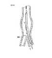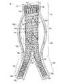 中間部分(710) は、分岐点(728) を起点とし収容穴(704) まで続く。中間部分(710) では、ステント移植片は、ほぼ管状の単一管腔ステント構造によって取巻かれた、2つの管腔に分岐された内側移植片構造を有している。最後に、基端部分(712) は、ステント部材と移植片部材とのための単一の管腔構造であり、同側の脚部穴(706) で終わる同側脚部(726) を有する。 The middle part (710) starts from the branch point (728) and continues to the accommodation hole (704). In the intermediate portion (710), the stent-graft has an inner graft structure bifurcated into two lumens surrounded by a generally tubular single lumen stent structure. Finally, the proximal portion (712) is a single lumen structure for the stent and graft members and has an ipsilateral leg (726) that terminates in an ipsilateral leg hole (706) .