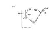 図5C、5Dは引込みアセンブリの他の実施態様を示している。このアセンブリの図は(図5A、5Bに示したのと同様に)、ほぼ円筒状の移植片とステントの間の位置から半径方向外側を見た図である。この実施態様では、フィラメントの一端部が拘束部材に固定され、他端がステントが拡張する際に円周方向に移動するステントの一部分へ固定されている上述の実施態様とは対照的に、フィラメントの他端は、ステントが拡張した時に、ステントの長手方向の軸(軸方向)にほぼ平行に移動するステントの一部分に固定されている。この実施態様では、ステント部材(126′)(これはこの図に示すように形成され得るアイレット又はループを含んでいるという点でステント(126)とは異なる)の最後の螺旋形部分の少なくとも一つの頂部(364)が、大多数の頂部(366)より短く(低く)作られている。しかしながら、さもなければ、頂部は、例えば図5A、5Bにおいて示すように形成されても良い。フィラメント(362)は、一端において頂部(364)へ、他端において拘束部材(102)の一端部へ結ばれる、又は固定される。図5Dに示すように、ステントの半径方向の拡張に際して、内方に位置した頂部(364)は、ステントの最後の又は最も外方に位置した螺旋の巻回に設けられた完全な高さの頂部(366)より長手方向又は軸方向に大きく収縮する。この比較的大きな収縮は、フィラメント(362)を通して直接的に伝達され、拘束部材(102)の端部が、頂部(366)に対して引込まれるようにする。上述したように、他の同様に構成された引込み機構が、拘束部材の他端に設けられても良い。 Figures 5C and 5D show another embodiment of a retraction assembly. The view of this assembly (similar to that shown in FIGS. 5A and 5B) is a view radially outward from a position between the generally cylindrical implant and the stent. In this embodiment, one end of the filament is secured to the restraining member and the other end is secured to a portion of the stent that moves circumferentially as the stent expands, as opposed to the embodiment described above. The other end of the stent is secured to a portion of the stent that moves substantially parallel to the longitudinal axis (axial direction) of the stent when the stent is expanded. In this embodiment, at least one of the last helical portions of the stent member (126 ') (which differs from the stent (126) in that it includes an eyelet or loop that can be formed as shown in this figure). One top (364) is made shorter (lower) than the majority (366). Otherwise, however, the top may be formed as shown, for example, in FIGS. 5A and 5B. The filament (362) is tied or fixed at one end to the top (364) and at the other end to one end of the restraining member (102). As shown in FIG. 5D, upon radial expansion of the stent, the inwardly located apex (364) has a full height provided in the last or most outwardly located spiral turn of the stent. It contracts more in the longitudinal direction or axial direction than the top (366). This relatively large contraction is transmitted directly through the filament (362), causing the end of the restraining member (102) to be retracted relative to the top (366). As described above, another similarly configured retraction mechanism may be provided at the other end of the restraining member.