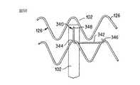 図5Aは、圧縮された状態のステントを示している。上述したように、ステントが拡張すると、図5Bに示すようにステントの部材は、ステントを半径方向に拡張する。頂部(344)と(346)の間の距離は、ステントが拡張すると大きくなるが、フィラメント(342)は比較的柔軟性が無く、弾力性が無いので、取付け位置(348)と頂部(344)の間の距離が必然的に減少する。その結果、図5Bに示すように、拘束部材(102)の端部をステント(126)に対して引込む。以上のようにこの実施態様では、拘束部材の長手方向の軸に沿った引込みは、ステント(126)の隣接する頂部の間の距離を拡張することによって行われる。拘束部材の一端における引込み機構を一つだけ示したが、他の同様に形成、構成された引込み機構が、拘束部材の他の端部において使用可能である。 FIG. 5A shows the stent in a compressed state. As described above, when the stent is expanded, the stent members expand the stent radially, as shown in FIG. 5B. The distance between the tops (344) and (346) increases as the stent expands, but the filament (342) is relatively inflexible and inelastic, so the attachment location (348) and the top (344) The distance between inevitably decreases. As a result, as shown in FIG. 5B, the end of the restraining member (102) is retracted with respect to the stent (126). As described above, in this embodiment, retraction along the longitudinal axis of the restraining member is accomplished by extending the distance between adjacent tops of the stent (126). Although only one retracting mechanism at one end of the restraining member is shown, other similarly formed and configured retracting mechanisms can be used at the other end of the restraining member.