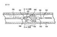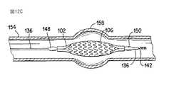 搬送カテーテルは好ましくは多管腔カテーテルである。カテーテル(136) の基部は、ガイドワイヤ(142) の入口(142′) を有し、且つ糸状結合部材(104) のリード(132) に結合された展開ノブ(144) を有するハブ(140) に結合されている。したがって、ノブ(144) が引込まれると、拘束部材(102) が解放され、その結果ステント移植片が拡がる。ハブ(140) にはまた従来技術で公知のように押し流し口(146) を設けてもよい。展開される前に、ステント移植片(106) は、拘束されたステント移植片の基端部分と末端部分にそれぞれ隣接して搬送カテーテル(136) の周りに配置されている基部障壁(148) と末端障壁(150) とによって、軸方向の所定位置に保持される。基部及び末端の障壁(148, 150)は多管腔カテーテル(136) に固く固定されて拘束されたステント移植片の軸方向のどの運動も制限することができる。これら障壁は好ましくはステント移植片又は拘束部材に当接するよう位置決めされる。結合部材(104) のリード(132) を搬送カテーテル(136)の管腔に連通している基部障壁(148) の開口(152) に通し、このリード(132) が展開ノブ(144) に結合されるようにする。図9Aと9Bはカテーテル(136) と拘束されたインプラントとが血管(154) を通って所望の部位に向って進むところを示している。図10Aと10Bを参照すると、拘束されたステント移植片が所望の部位(156) に到達すると、展開ノブ(144) が引込まれ、その結果結合部材(104) が拘束部材から引き抜かれるにつれてステント移植片が図面に示すように連続的に拡張するようになる。結合部材は好ましくはステント移植片の末端から基端への方向(すなわち、カテーテル先端からカテーテルハブの方向)でステント移植片の拡張を促すように配置される。図11Aと11Bは、結合部材とカテーテルが取出された後のステント移植片(106) と拘束部材(102) の最終移植位置を示している。他の実施態様では、複数の拘束部材が図9Cに示すように用いられ得る。複数の結合部材(104) が同時に解放されるとインプラントの展開時間は短縮され得る。 The delivery catheter is preferably a multi-lumen catheter. The base of the catheter (136) has an inlet (142 ') for a guide wire (142) and a hub (140) having a deployment knob (144) coupled to the lead (132) of the thread-like coupling member (104). Is bound to. Thus, when the knob (144) is retracted, the restraining member (102) is released, resulting in the expansion of the stent-graft. The hub (140) may also be provided with a flush port (146) as is known in the art. Prior to deployment, the stent-graft (106) includes a proximal barrier (148) disposed about the delivery catheter (136) adjacent to the proximal and distal portions of the constrained stent-graft, respectively. It is held in place in the axial direction by the end barrier (150). The proximal and distal barriers (148, 150) can limit any axial movement of the stent-graft that is rigidly secured and constrained to the multi-lumen catheter (136). These barriers are preferably positioned to abut the stent-graft or restraining member. The lead (132) of the coupling member (104) is passed through the opening (152) of the base barrier (148) communicating with the lumen of the delivery catheter (136), and the lead (132) is coupled to the deployment knob (144). To be. 9A and 9B show the catheter (136) and the constrained implant traveling through the blood vessel (154) toward the desired site. Referring to FIGS. 10A and 10B, when the constrained stent-graft reaches the desired site (156), the deployment knob (144) is retracted, resulting in stent implantation as the coupling member (104) is withdrawn from the constraining member. The strips expand continuously as shown in the drawing. The coupling member is preferably arranged to facilitate expansion of the stent-graft in the distal-to-proximal direction of the stent-graft (ie, from the catheter tip to the catheter hub). FIGS. 11A and 11B show the final implantation position of the stent-graft (106) and restraining member (102) after the coupling member and catheter have been removed. In other embodiments, a plurality of restraining members may be used as shown in FIG. 9C. If multiple coupling members (104) are released simultaneously, the deployment time of the implant can be shortened.