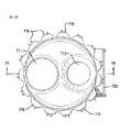 収容穴(704) は周縁の大部分がワイヤ構造によって支持され、その結果展開後には収容穴(704) を開いた状態が維持される。好ましい実施態様では収容穴(704) を支持するワイヤ構造は独立ワイヤリング(714) である。 独立ワイヤリング(714) は中間部分(710) の収容穴(704) の全域に配置される。この独立ワイヤリング(714) は、収容穴(704) の移植片材料が開放位置で支持され対側脚部(730) の末端(734) を受け入れるのを確実にする。このような支持体がない場合は、収容穴(704) を本体(700) の搬送後に確実に開くことができないが、その理由は、中間部分(710) の内部では収容管腔(703) の領域の分岐した移植片部材がその内周面に十分なステント支持体を有しないからである。これは図18で明らかなように、収容管腔(703) の領域の内側の移植片周面(785) に内部ステント支持体が存在しないことを示している。 Most of the peripheral edge of the receiving hole (704) is supported by the wire structure, and as a result, the state where the receiving hole (704) is opened is maintained after deployment. In a preferred embodiment, the wire structure supporting the receiving hole (704) is an independent wiring (714). The independent wiring (714) is disposed over the entire area of the receiving hole (704) of the intermediate portion (710). This independent wiring (714) ensures that the graft material in the receiving hole (704) is supported in the open position and receives the distal end (734) of the contralateral leg (730). In the absence of such a support, the receiving hole (704) cannot be reliably opened after the main body (700) is transported, because the inside of the intermediate part (710) has the receiving lumen (703). This is because the graft member having a branched region does not have sufficient stent support on the inner peripheral surface thereof. This shows that there is no internal stent support on the graft periphery (785) inside the region of the containment lumen (703), as is apparent in FIG.