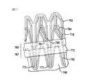 分岐流を生成することは可能となるが、分岐したステント部分がないため製造は簡単となる。例えば分岐したステント部分を一体として巻くことはより複雑な工程となる。同様に、別々の円筒状のステント構造を巻き、これを連結して分岐したステント構造を形成することは複雑であり、結局信頼性の低いものとなり得る。中間部分(710) により、本体(700) を覆う全体のステント部材を多数回螺旋状に巻いて配列した単一の波状のワイヤから作ることが可能になる。この結果製造が簡単で容易に圧縮できまた展開時に確実に拡張する分岐したステント移植片装置が得られる。 A bifurcated flow can be generated, but manufacturing is simplified because there are no branched stent portions. For example, winding a branched stent portion together is a more complicated process. Similarly, winding separate cylindrical stent structures and connecting them to form a bifurcated stent structure is complex and can ultimately be unreliable. The intermediate portion (710) allows the entire stent member covering the body (700) to be made from a single wavy wire arranged in a helical fashion. This results in a bifurcated stent-graft device that is simple and easy to manufacture and that expands reliably upon deployment.