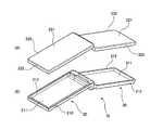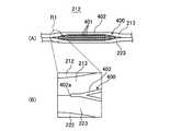 下ケース220の立壁222には、ケーブル400(図8参照)が通過する部分に、その部分の両側の部分と比べ立壁の高さが減ぜられた窪み形状222aを有する。図8に示すように、上ケース210の垂壁212についても同様であり、ケーブル400が通過する部分に、その垂壁の高さが減ぜられた窪み形状212aを有する。ケーブル400は、立壁222および垂壁212の、窪み形状222a,212aの部分を通過し、垂壁221の下端面に貼着された両面テープ213と立壁222の上端面に貼着された両面テープ223に挟まれている。  The standing