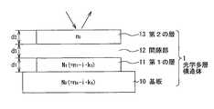 本発明の光学多層構造体では、また、間隙部の大きさを0に固定し、基板と、この基板に接して形成された、光の吸収のある第1の層と、この第1の層の前記基板とは反対側の面に接して形成された第2の層とを備えた構成とすることにより、反射防止膜として利用することが可能になる。