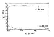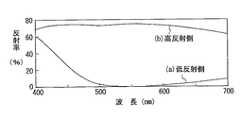 透明な基板上に透明な光学膜を形成すると、図5(B)に示したような光学アドミッタンスダイヤグラム上で、膜厚の増加に伴い円弧を描いて軌跡が移動する。ここに、横軸はアドミッタンスの実軸(Re),縦軸はアドミッタンスの虚軸(Im)をそれぞれ示している。例えば、n=y=1.52のガラス基板上にn=y=2.40のTiO2などを成膜すると、その合成光学アドミッタンスの軌跡は、膜厚の増加に伴ってy=1.52の点から円弧を描きながら移動する。もし、TiO2の光学的な膜厚がλ/4のときには、合成アドミッタンスの軌跡は実軸上の2.42/1.52の点、すなわち3.79の点に帰着する(λ/4法則)。これはガラス基板(透明基板)上にλ/4の膜厚のTiO2膜(第1の層)を成膜したときの合成アドミッタンスである。つまり、この構造体を上から見ると、あたかもn=3.79の一体の基板を見ているのと同じようになる。このときの反射率は、空気との界面では次式(4)で求まるので、反射率R=33.9%となる。