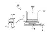 この図2において、PC100は、各種入力画面(後述の図4〜図7等参照)等の所定の表示を行うための上記表示部101と、操作者が操作入力を行うための適宜のボタン、キー、マウス等を備えた上記操作部102と、上記タグカード1によって所定の処理を行える(詳細は後述)電子ファイル等が格納され記憶手段(記憶部)として機能するデータベース103と、上記タグカード製造装置300との間で接続手段2を介して行われる通信の制御を行う通信制御部104と、これら表示部101、操作部102、データベース103及び通信制御部104を含むPC100全体の動作を制御する制御回路105とを有する。  In FIG. 2, the