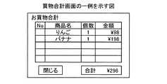 また、利用者が買物合計を選択した場合、メインメニュー制御部14は、買物合計画面を表示し、買物合計表示制御部15が蓄積している買物リスト情報の全ての商品情報と合計金額を出力する。  When the user selects a shopping total, the main