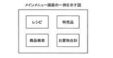 メインメニュー制御部14は、メインメニュー画面を表示し、利用者が選択したメニューに応じた処理を行う処理部である。図4は、メインメニュー画面の一例を示す図である。同図に示すように、利用者は、メインメニュー画面より、レシピ、特売品、商品検索、またはお買物合計のいずれかのメニューを選択することができる。  The main