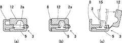 図12は、図11と同じ部位を示す図面であるが、レンズ折り畳み後のレンズ2の移植方法を説明するためのものである。具体的には、図10のD−D矢視を示す斜視図であり、(a)はプランジャー軸4aによりレンズ2を押し出す場合を示し、(b)は鑷子15によりレンズ2を把持する場合を示している。インジェクター1を使用してレンズ2を移植する場合には、(a)に示すように2つの折り畳み部材8を両側から押してレンズ2を折り畳んだ後、プランジャー軸4aによりレンズ2を押圧して移植する。一方、インジェクター1を使用せずに鑷子15によりレンズ2を把持して移植する場合には、(b)に示すようにレンズ折り畳み後に開閉蓋12を取外し、その後、鑷子15により折り畳んだレンズ2を把持して眼内に移植することができる(図15参照)。FIG. 12 is a view showing the same portion as FIG. 11, but is for explaining a method of transplanting the