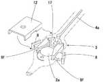 本実施例は、レンズ設置部5に2つの折り畳み部材8を設け、前記2つの折り畳み部材8を板バネ17により連結すると共に、前記折り畳み部材8に突起8fを設けて本体3の適所に係止し、前記板バネ17の付勢力に抗して前記折り畳み部材8の位置を保持可能としたものである。ただし、板バネ17による連結方法が第3実施例と異なっている。2つの折り畳み部材8は略八の字状に配置され、その一端を板バネ17により連結している。そして、板バネ17を中心にして2つの折り畳み部材8が所定角度だけ回動できるようにされている。すなわち、2つの折り畳み部材8を外方に開いた状態ではレンズ設置部5において、2つの折り畳み部材8は略八の字状に配置され、レンズ光学部2aを設置できるだけのスペースが確保される。したがって、この状態においてはレンズ光学部2aに余分な応力を与えることなくレンズ2を設置できる。レンズ設置後、開閉蓋12を本体3に装着することによりレンズ2のセットは完了する。また、開閉蓋12の裏面には図示しないが、レンズ2の位置を固定するための複数の突起と折り畳み部材8の動きを固定するための複数の突起が設けられており、開閉蓋12を本体3に装着することによりレンズ2の動きと折り畳み部材8の動きを規制することができるようになっている。さらに、開閉蓋12にはプランジャー軸4aの動きを規制する突き当てを設け、プランジャー4の誤操作によってレンズ2が押圧されないようにされている。In this embodiment, two