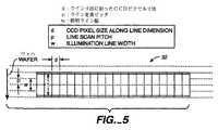 ライン20、260は、1.5ミクロン、3.0ミクロンおよび4.25ミクロンなどの異なった幅、または約1ミクロンから5ミクロンの範囲内にある異なった幅を持つように焦点が合わされ、その場合ライン幅は、強度が1/e2 より低いピーク強度になるポイント間の距離によって規定される。検出器アレイの出力は、各ライン領域の幅内で約3回サンプリングが行われて、0.5ミクロン、1.0ミクロンおよび1.42ミクロンの帯状部方向におけるピクセル寸法、または約0.4ミクロンから1.5ミクロンの範囲内の帯状部方向におけるピクセル寸法を与える。