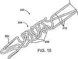本発明のアタッチメントエレメントのさらに他の実施形態は、図15および図16に示すような軸バネを備える。アタッチメントエレメント200は、末端蛇行リング202と、多数の軸方向蛇行バネエレメント206を備える中間バネ構造204とを備える。蛇行リングエレメント206の性質は、図16の展開構成において見ることができる。任意に、第2の蛇行リング210を、アタッチメント構造200と中間切込形成部212のらせん状切込形成エレメントの間に設けてもよい。  Still another embodiment of the attachment element of the present invention includes an axial spring as shown in FIGS. 15 and 16. The