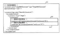 図3−1は、制約条件の定義をXML Schemaの形式で表したものである。第1の実施の形態では制約条件311をMPEG21のRELに準拠し、MPEG21のRELを拡張した形式で定義している。すなわち、図3−1に示すように、MPEG21のRELにおける"Right"(許諾操作)エレメントの拡張として"adaptWithConstraint"という許諾操作を定義し、補完制約312と排他制約313という2つの制約のいずれかまたは両方を指定するように当該許諾操作を定義している。このように、MPEG21のRELにおける許諾操作("Right")に制約を有するように拡張された許諾操作が、本発明における制約条件に相当する。 FIG. 3A illustrates the definition of the constraint condition in the XML Schema format. In the first embodiment, the constraint condition 311 is defined in a format that complies with the REL of MPEG21 and expands the REL of MPEG21. That is, as shown in FIG. 3A, a permission operation “adaptWithConstraint” is defined as an extension of the “Right” (permission operation) element in the REL of MPEG21, and either one of two constraints, a