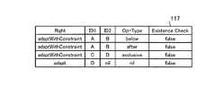 制約条件が存在する場合は(ステップS1407:YES)、再利用ライセンス処理部103は制約条件を含むデータを操作テーブル117に追加する(ステップS1409)。具体的には、許諾操作(Right)には制約条件を有するように拡張された許諾操作("adaptWithConstraint")、主コンテンツのコンテンツID(ID1)には現在処理しているコンテンツのコンテンツID、制約対象コンテンツのコンテンツID(ID2)には制約条件の相手となるコンテンツのコンテンツID、制約種別(Op-Type)にはコンテンツのライセンス情報131から取得した制約種別、ExistenceCheckにはfalseを設定したデータを操作テーブル117に追加する。 When the constraint condition exists (step S1407: YES), the reuse