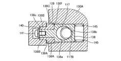 広く形成されているボルト挿入用貫通孔130eの一部を画成する本体130の一部であって拡径部139Aの雄ネジ139Cに対向する位置には、雌ネジ130fが螺刻されている。雌ネジ130fには駆動部材139の拡径部139Aの雄ネジ139Cが螺合しており、駆動部材139が係合部材延出部138Bを中心として回転することにより、ボルト117の軸方向へ螺進退可能に構成されている。雌ネジ130fは本体雌ネジに相当する。  A