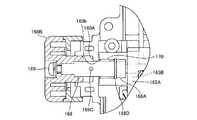 ストッパポール165の狭幅部165Aであって図11に表れている部分の裏側には、図14に示されるようにラック165Bが形成されている。また、ハウジング20,21には、ハウジング163、164内部と外部とを連通する軸挿入用貫通孔160bが形成されている。  On the back side of the