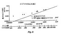 図9は、たわみ剛度と比較した、本発明の超微小機械化ガイドワイヤの最大ねじれ強さのグラフである。縦軸は、ポンド−インチの単位でガイドワイヤの最大ねじれ強さを示し、そして横軸はたわみ剛度(psi)を示す。図8では、四角のデータの点は、超微小機械化カテーテルガイドワイヤの実際の試験結果を示し、そして実線は、中実円形断面のカテーテルガイドワイヤについての理論的結果を示す。このグラフから、このガイドワイヤのたわみ剛度(またはサイズ)が減少するにつれて、予期されるかまたは理論的なねじれ強さもまた減少することが明らかである。これは、実線によって示される。しかし、実際の試験結果が示すように、超微小機械化ガイドワイヤのサイズまたはたわみ強さが減少した場合、ねじれ強さは、予期したようには相応して減少していない。代わりに、実線からのデータ点の相違から見られ得るように、ガイドワイヤのねじれ強さは、かなりゆっくりした割合で減少する。この状況は、わずかに異なる方法で図10に示してあり、この図10は、そのねじれ剛度(psi)と比較した、本発明の超微小機械化ガイドワイヤのたわみ強さのグラフを提供する。ここでも、実際の結果は、より小さく、かつより柔軟性のガイドワイヤについて予期された結果とは異なる。