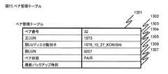 ペア管理テーブル(1301)は、対象ペアに関する情報を管理するためのテーブルである。ペア管理テーブル(1301)には、例えば、ペア番号(1302)、正LUN(1303)、副LUディスク識別子(1304)、副LUN(1305)、ペア状態(1306)及び最終バックアップ時刻(1307)が記録される。 The pair management table (1301) is a table for managing information related to the target pair. The pair management table (1301) includes, for example, a pair number (1302), primary LUN (1303), secondary LU disk identifier (1304), secondary LUN (1305), pair status (1306), and last backup time (1307). To be recorded.