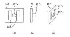 図8は本発明の第1の実施形態に係るサービスコンセントの外観図であり、図8(A)は正面図、図8(B)は側面図、図8(C)は斜視図をそれぞれ示す。図8に示すように、ボタン107bは、サービスコンセント107から外部に突出し、外部から接続される電源プラグ等により押下される位置に設けられる。例えば、サービスコンセント107の、一対の電源プラグの差込口107oの間に設けられる。なお、ボタン107bの設けられる位置は、電源プラグの差込口107oに限られず、電源プラグの差込口107oの近傍に設けられてもよい。これにより、サービスコンセントに電源プラグや電源アダプタが接続されることにより、ボタン107bが自動的に押下されるので、サービスコンセント107の接続を、機械的に検出することができる。  8A and 8B are external views of the service outlet according to the first embodiment of the present invention. FIG. 8A is a front view, FIG. 8B is a side view, and FIG. 8C is a perspective view. . As shown in FIG. 8, the