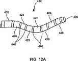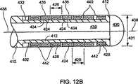 本発明に従う医療用カテーテルの代替的実施形態は、図12Aおよび図12Bに関連して記載される。示されるように、カテーテルは、作業管腔439および長軸方向軸438を有する細長本体412を備える。複数の相隔する電極424は、本体412上に配置される。電極424の間に置かれるのは、複数の組織配向検出器428である。一実施形態において、組織配向検出器428は、トランスデューサ素子428を備える。配向検出器428がトランスデューサ、特に超音波トランスデューサを備える実施形態について、検出器428は、検出器428の少なくともいくつかの外面446に作動可能に取り付けられた、一以上の整合層442を備え得る。整合層442は、トランスデューサ428の性能を改善するように作動する。本発明の範囲内において、検出器428はまた、整合層442なしで作動し得る。さらに、別の様式で細長本体412に接続されて示されるが、電極424および検出器428の並べ方は、本発明の範囲内において変化し得る。Once the