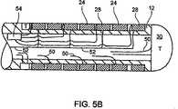 細長本体12は、好ましくは、作業管腔39を備える。これを通って長軸方向軸38が通る。図4Aに最もよく示されるように、整合層42は、トランスデューサ素子28の外部表面の周辺に拡がる。整合層42は、トランスデューサ素子28に、好ましくはエポキシなどを用いて作動可能に取り付けられる。トランスデューサ素子28は、エポキシを含む種々の様式で、細長本体12に作動可能に取り付けられ得る。管腔39の使用は、図5Aおよび図5Bに最もよく示される。これらの図は、本発明の装置2の2つの代替的実施形態を示す。  The