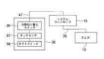 図5は、リモコン36の構成を示す図である。タッチセンサ57、タクトスイッチ58は、リモコンケーブル47を介してシステムコントローラ15に接続されている。システムコントローラ15は、映像ケーブル39を介してモニタ12に接続されている。