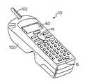本明細書中で実施され図1A−1Dに示されているように、本発明の種々の実施例による光学読取装置の斜視図が開示されている。図1Aは、手持ち式無線光学読取装置10の下面を示す。図1Bは、図1Aに示されている光学読取装置の上面を示す。光学読取装置10は、ハウジング100、アンテナ102、窓104及びトリガ12を有する。窓104は照射アセンブリ20及び撮像アセンブリ30を収容する。図1Bに示されているように、読取装置10の上面は、ファンクションキー14、英数字キーパッド16及びディスプレイ60を備える。ある実施例では、ファンクションキー14は、エンターキーと上下カーソルキーを有する。図1Cもまた手持ち式無線光学読取装置10である。読取装置10は、ファンクションキー14、英数字キーパッド16、筆記用スタイラス18、ディスプレイ60及び署名ブロック62を有する。スタイラス18はユーザが署名ブロック62に署名を書き込むのに使用される。図1Dは本発明の光学読取装置10のさらなる他の実施例を示す。この実施例では、読取装置10はガン形状のハウジング100を有する。ディスプレイ60およびキーパッド16は、ガン形状ハウジング100の上面部分に配置され、トリガ12は、ハウジング100の上面部分の下面に配置される。ハウジング100はまた、照射アセンブリ20と撮像アセンブリ30を収容する窓104を具備する。ワイヤ106は、ハウジング100の柄先に配置される。ワイヤ106によって、光学読取装置10に、ホストプロセッサや他のデータ収集装置などの外部装置のためのハードワイヤード通信リンクが提供される。  As implemented herein and shown in FIGS. 1A-1D, a perspective view of an optical reader according to various embodiments of the present invention is disclosed. FIG. 1A shows the underside of the handheld wireless