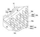 本実施態様にけるコネクタ本体41は、上記第1の実施態様と同様に、電気的に絶縁性の合成樹脂からなり、前後の側壁42、44、左右の側壁43、45及び底壁46を含み、コネクタ本体41の底壁46には、複数の雄コンタクト50を保持するための細長いスリット47が複数形成されている。  As in the first embodiment, the