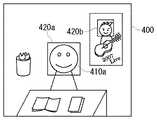図12(a)、(b)は、ユーザが部屋を動き回る場合における注目領域の決定方法を説明する図である。図12(a)のように、ユーザが席に座っている間、検出された自分の顔410aを含む領域420aが注目領域に設定される。図12(b)のように、ユーザが一時的に席を離れて部屋を動き回るとき、検出される顔410cの移動に合わせて注目領域が設定されると、ユーザの移動によって自分の部屋の様子が明瞭に映し出されることになってしまう。そこで、画面の中央から離れた位置にある顔領域420cが検出されても、注目領域には選択しないという判断基準を設けてもよい。  FIGS. 12A and 12B are diagrams illustrating a method of determining a region of interest when a user moves around a room. As shown in FIG. 12A, while the user is sitting on the seat, an