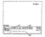 ブラウズ・モードにおいて、視聴者は、以前に選択したテレビプログラムを同時に引き続き視ながら、視ているチャンネルのみならず、すべてのチャンネルのプログラムスケジュール情報を走査することができる。図11に示すように、このモードにおいては、フリップ・モードで現れるグラフィックオーバーレイ情報はブラウズの対象となるチャンネルのプログラム情報に置き換えられる。その情報は視聴者が現在視ているチャンネルの情報であることもあり、他のチャンネルの情報であることもある。視聴者がブラウズ・モードに入るためにリモートコントローラ40から指令を発した後に、フリップ・モードの場合と同様に、グラフィックオーバーレイ111が現れ、現在選択されているチャンネル112のプログラムスケジュール情報及びテキスト形式のブラウズ表示部113が示される。これにより、図11に示されるように、視聴者に現在のアクティブ・モードを示す。  In the browse mode, the viewer can scan program schedule information for all channels, not just the channel being viewed, while continuing to watch a previously selected television program simultaneously. As shown in FIG. 11, in this mode, graphic overlay information appearing in the flip mode is replaced with program information of a channel to be browsed. The information may be information on a channel that the viewer is currently viewing, or information on other channels. After the viewer issues a command from the