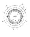 図2に示すように、ルーレット装置3は筐体2に固定される枠体21と、枠体21の内側に回転可能に収納支持されたウィル22とから基本的に構成されている。そして、ウィル22上面には凹状のナンバーポケット23及びボーナスポケット24が多数(本実施形態では計38個)形成されている。更に、各ナンバーポケット23の外方向におけるウィル22の上面には、各ナンバーポケット23と対応するように図形文字としての「0」、「1」〜「36」の各数字が表示された番号表示板25が形成されている。即ち、言い換えれば、「0」、「1」〜「36」の内、いずれか一の数字が付与されたナンバーポケット23がウィル22に対して計37個形成されている。また、ボーナスポケット24の外方向におけるウィル22の上面には、ボーナスポケット24と対応するように英文字の「B」が表示されたボーナス表示板26が形成されている。Next, the configuration of the