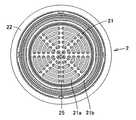図3は、親水性フィルタを除いた状態のキャップの下面図である。親水性フィルタ29が接触する箇所には、同心円上に配置された多数のリブ21aが設けられている。リブ21aは、その中心から放射状に延びる線と交差する部分に、不連続部が設けられている。不連続部においては、リブ21aは設けられていない。  FIG. 3 is a bottom view of the cap with the hydrophilic filter removed. A large number of