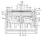 管体35の下部は円柱状に構成されている。中間部および上部は、下部より大径とされ、さらに、この大径の部分には縦に延びる通気溝35aが設けられている。管体35の下部は、環状弁42の内周面に密着し、通気溝35aは空気送出路43を構成する。  The lower part of the