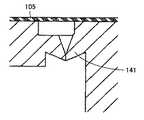 特許文献1に記載の薬液容器においては、図7に示すように、キャップ102の内側に設けられたフィルタ取付部材103の一方の面に疎水性フィルタ105を設け、他方の面に親水性フィルタ104を設けている。また疎水性フィルタ105と容器内部との間に流量制限部が設けられている。流量制限部は、逆止弁141、またはオリフィスで構成されている。  In the chemical container described in