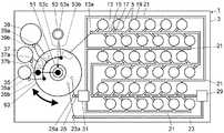 図12に示すように、切替えバルブ63を回転させてエアー吸引用流路39aとシリンジ流路51cを接続し、エアー吸引用容器エアー抜き流路39bをエアー抜き流路53bに接続する。シリンジ51を吸引側に駆動させてエアー吸引用容器39内の気体を切替えバルブ63内の流路、シリンジ流路51c及びシリンジ51内に吸引する。このとき、エアー吸引用容器39はエアー抜き流路39e,39d,39b、切替えバルブ63及びエアー抜き流路53bを介してベローズ53に接続されているので、エアー吸引用容器39内の減圧にともなってベローズ53が収縮する(白抜き矢印参照)。  As shown in FIG. 12, the switching