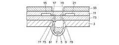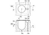保持プレート33は反応プレート3側の面に抜け止め用の複数の突起100を備えている。突起100は図1(A)に示されているように、各反応室の注入流路17の近傍と、反応室が配置されている領域の周囲の適当な位置に設けられている。突起100は基端部101が円柱状で、先端に球面状の膨張部102をもっている。突起100は先端部から基端部101にわたって軸方向に延びる切欠き104が設けられており、突起100自身の弾性力により切欠き104が開く方向に付勢されている。切欠き104が開いた状態では膨張部102の寸法が基端部101の直径よりも大きくなっている。膨張部102に切欠き104を閉じる方向の力が働くと切欠き104は閉じることができ、切欠き104が閉じると膨張部102の寸法は基端部101の直径よりも小さくなる。A structure for fixing the