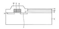 次いで、MOCVD法によりn−GaN(n−GaN層10となる)とp−GaN(p−GaN層11となる)を順次、成長させる(図6)。その際、n−GaNおよびp−GaNは、AlN等の絶縁層9の上にのみ選択的に成長する。なお、GaNの成長方法については、例えば特開2003−59948号公報に開示されている。次いで、P−GaN膜を例えばドライエッチングなどによりフォトエッチングして、MIS領域寄りの部分にのみp−GaN層11を残す(図7)。  Next, n-GaN (which becomes the n-GaN layer 10) and p-GaN (which becomes the p-GaN layer 11) are sequentially grown by MOCVD (FIG. 6). At that time, n-GaN and p-GaN are selectively grown only on the insulating