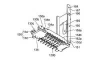 ソケットコンタクト部120の接触部120aは、モジュール210が電子部品接続用コネクタ100の開口部110に、上方から挿入された際に、モジュール210における基板212の凹部216(図1参照)に案内され、モジュール210の接続端子部215(図1参照)と接触する。コンタクトリード部120bは、電子部品接続用コネクタ100が実装される基板上に配置された際に、基板上に接続される。  The