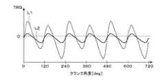 図8は、フュエルカット運転中におけるエンジン出力トルクTRQの変化の一例(エンジン回転数NE=1200rpm)を示す図であり、破線L1が一部気筒運転に対応し、実線L2が全筒運転に対応する。この図から明らかなように一部気筒運転中の方が、トルク変動が大きくなるため、フュエルカット運転中は、通常運転中に比べてより高い回転数で一部気筒運転から全筒運転へ移行することにより、フュエルカット運転中の不快な車体振動を防止することができる。 FIG. 8 is a diagram showing an example of a change in the engine output torque TRQ (engine speed NE = 1200 rpm) during the fuel cut operation, where the broken line L1 corresponds to the partial cylinder operation, and the solid line L2 corresponds to the all cylinder operation. To do. As is clear from this figure, the torque fluctuation is larger during partial cylinder operation, so during fuel cut operation, transition from partial cylinder operation to full cylinder operation is performed at a higher rotational speed than during normal operation. By doing so, unpleasant vehicle body vibration during the fuel cut operation can be prevented.