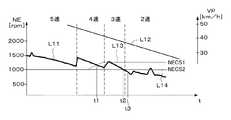 図9は、制御動作例を説明するためのタイムチャートである。実線L11及びL12は、それぞえエンジン回転数NE及び車速VPの推移を示す。また破線L13は、ロックアップクラッチの係合度合RECLが100%である場合の下側下限回転数NECSLLを示し、実線L14は係合度合RECLが90%以下である場合の下側下限回転数NECSLLを示す。図9に示される減速運転においては、当初ギヤ位置GPが5速にあり、フュエルカット運転及び一部気筒運転が行われており、車速VPの低下に伴ってシフトダウンが行われる。ロックアップクラッチの係合度合RECLが100%であるときは、時刻t1においてエンジン回転数NEが下側下限回転数NECSLLに達するため、一部気筒運転から全筒運転へ移行する。その後時刻t3において、フュエルカット運転を終了する。また係合度合RECLが90%以下であるときは、時刻t2においてエンジン回転数NEが下側下限回転数NECSLLに達するため、一部気筒運転から全筒運転へ移行する。係合度合RECLが90%と100%の間にあるときは、時刻t1より後で時刻t2より前に一部気筒運転から全筒運転への移行が行われる。このように係合度合RECLが高いほどより高いエンジン回転数NEで一部気筒運転から全筒運転への移行を行うことにより、不快な車体振動を確実に防止することができる。 FIG. 9 is a time chart for explaining an example of the control operation. Solid lines L11 and L12 indicate changes in the engine speed NE and the vehicle speed VP, respectively. A broken line L13 indicates a lower lower limit rotational speed NECSLL when the engagement degree RECL of the lockup clutch is 100%, and a solid line L14 indicates a lower lower limit rotational speed NECSLL when the engagement degree RECL is 90% or less. Indicates. In the deceleration operation shown in FIG. 9, the initial gear position GP is at the fifth speed, the fuel cut operation and the partial cylinder operation are performed, and the downshift is performed as the vehicle speed VP decreases. When the engagement degree RECL of the lockup clutch is 100%, the engine speed NE reaches the lower lower limit speed NECSLL at time t1, and therefore, the operation shifts from the partial cylinder operation to the all cylinder operation. Thereafter, at time t3, the fuel cut operation is terminated. When the degree of engagement RECL is 90% or less, the engine speed NE reaches the lower lower limit speed NECSLL at time t2, so that the operation shifts from partial cylinder operation to all cylinder operation. When the degree of engagement RECL is between 90% and 100%, the transition from the partial cylinder operation to the all cylinder operation is performed after time t1 and before time t2. As described above, the higher the degree of engagement RECL, the higher the engine speed NE and the transition from partial cylinder operation to all cylinder operation can reliably prevent unpleasant vehicle body vibration.