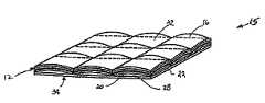 図7は、電子レンジ(不図示)からのマイクロ波エネルギーにさらされる、図5及び図6のマイクロ波相互作用要素15の例示的な素材を描写する。マイクロ波エネルギーの入射によりサセプタ12が加熱するにつれ、閉塞セル28内の第2のプラスチックフィルム22および基板20の間の狭い空間に通常保持されている水蒸気およびその他のガス、ならびに閉じ込められた空気が膨張する。閉塞セル28内の水蒸気および空気(またはその他の適切な物質)の膨張は、閉塞セル28の一方の側でサセプタ12および基板20に圧力を印加し、その反対側で第2のプラスチックフィルム22に圧力を印加する。閉塞セル28を形成する素材15の各側は、加熱および蒸気の膨張に、同時に、しかし独自に反応する。セル28は拡張または膨張し、第2のプラスチックフィルム22によって形成される底面34の上にある、サセプタ12および基板20のラミネーション内のチャネル(不図示)によって分離される、「枕」の、キルト状の上面32を形成する。この膨張は電圧を加えた電子レンジ内で1秒から15秒以内に生じる可能性があり、場合によっては2秒から10秒の間に生じることもある。  FIG. 7 depicts an exemplary material of the