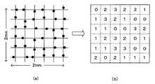 ドットパターンは、図3に例示するように、各ドットの位置がデータに対応付けされている。図3の例では、ドットの位置を格子の基準位置(縦線及び横線の交差点)から上下左右にシフトすることにより、0〜3の2ビット情報を表示した例である。このようにして表現された情報の組合せにより、専用ペーパー上の位置座標が決定される。図4(a)に例示するように、縦横2mmの範囲内に36個のドットが格子状に配置され、これらのドットにより示されるデータの配列(図4(b))が、その専用ペーパー上の位置座標と対応付けされている。よって、電子ペン10のカメラ16が図4(a)に示すようなドットパターンを撮影すると、プロセッサ11はカメラ16から入力されるドットパターンのデータに基づいて図4(b)に示すデータ配列を取得し、それに対応する専用ペーパー上の位置座標(即ち、そのドットパターンがその専用ペーパー上のどの位置にあるのか)をリアルタイムで算出する。なお、ドットパターンを認識する最小単位は2mm×2mmであり、カメラ16は毎秒100回程度の撮影を行う。  In the dot pattern, as illustrated in FIG. 3, the position of each dot is associated with data. In the example of FIG. 3, the 2-bit information of 0 to 3 is displayed by shifting the dot position vertically and horizontally from the reference position (intersection of vertical and horizontal lines) of the grid. The position coordinates on the dedicated paper are determined by the combination of information expressed in this way. As illustrated in FIG. 4A, 36 dots are arranged in a grid within a range of 2 mm in length and width, and the data array (FIG. 4B) indicated by these dots is displayed on the dedicated paper. Are associated with the position coordinates. Therefore, when the