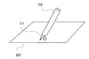 図1は電子ペンの使用形態を模式的に示す図であり、図2は電子ペンの構造を示す機能ブロック図である。図1に示すように、電子ペン10は、ドットパターンが印刷された専用ペーパー20と組み合わせて使用される。電子ペン10は、通常のインクペンと同様のペン先部17を備えており、利用者は通常のインクペンと同様に専用ペーパー20上に文字などを書くことになる。[Electronic pen]