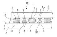 上述したような各変形例によるダミー電極の配設パターンによれば、電極端子1、3に隣接して配設するチップ側ダミー電極6又は基板側ダミー電極7の配設位置及び配設面積等を変化させて、チップ側ダミー電極6又は基板側ダミー電極7に吸着される過剰なはんだ粒子13の量を制御することができるので、用いるはんだ粒子の量に応じたダミー電極の配設パターンを選ぶことができる。  According to the dummy electrode arrangement pattern according to the above-described modifications, the arrangement position and area of the chip-