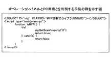 先ず、図1および図2において、スキャン画像管理サーバ2のレンダラ21はMFP1のオペレーションパネル11もしくはPC3のPC画面31に対してUI画面の提示を行うが、MFP1のオペレーションパネル11では文字列の入力等が困難であり、逆にPC3のPC画面31ではそれが容易であることから、異なる画面構成としている。図9はオペレーションパネル11とPC画面31とを判別する手法の例を示す図であり、ActiveXを使用したコードの例を示している。このコードはMFP1もしくはPC3のWebブラウザで実行されることで、MFPに固有のライブラリへのアクセスを試み、成功した場合にはMFP1であると判断し、失敗した場合はPC3であると判断するようになっている。  1 and 2, the